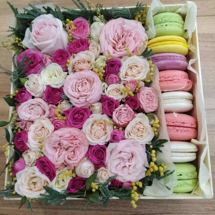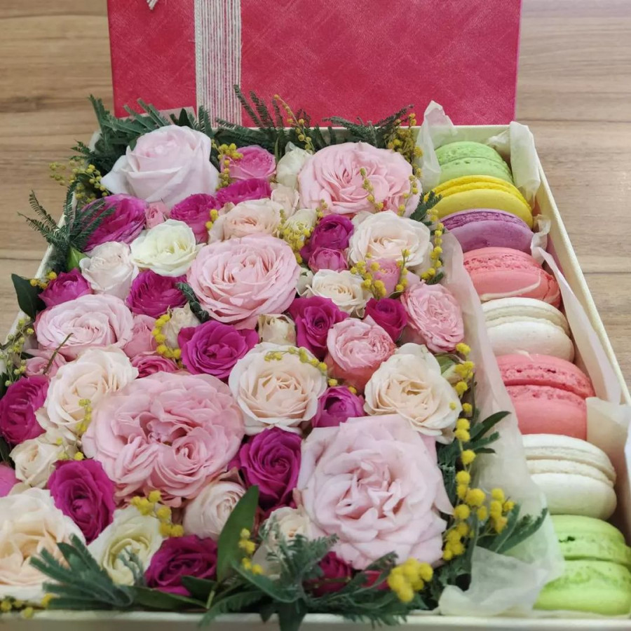 8 ярких макарун в сочетании с розами – это идеальный выбор для любителей сладостей и цветов. Розы украшены специальными лентами, которые придают им еще большую изящность и красоту. Коробка, в которой находятся макаруны, сделана из качественного материала и имеет удобную ручку для переноски. Такой букет станет прекрасным подарком для любого случая – дня рождения, свадьбы, или просто для поднятия настроения.