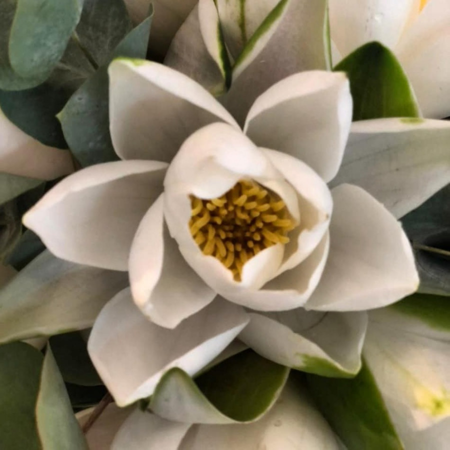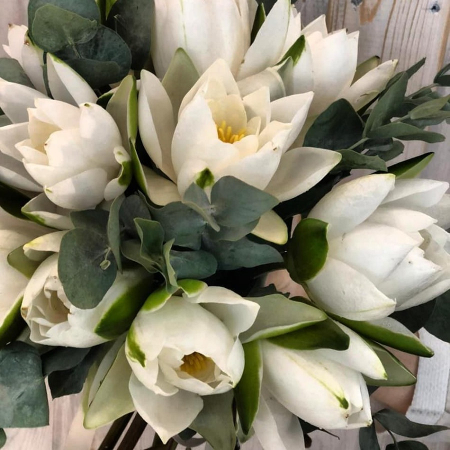 На фото свадебный букет из лотосов. В составе: лотос 15 шт, эвкалипт 9 шт, атласная лента 1 шт, . Все цветы свежие и ароматные, букет красиво оформлен и отлично подходит для подарка. Доступна доставка цветов или самовывоз.